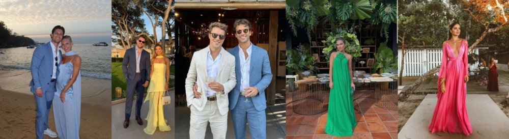 Para ELAS: Opte por cores suaves, como tons pastéis, terrosos ou nuances vibrantes sofisticadas. Tecidos fluidos e leves valorizam o movimento e harmonizam com o cenário natural.